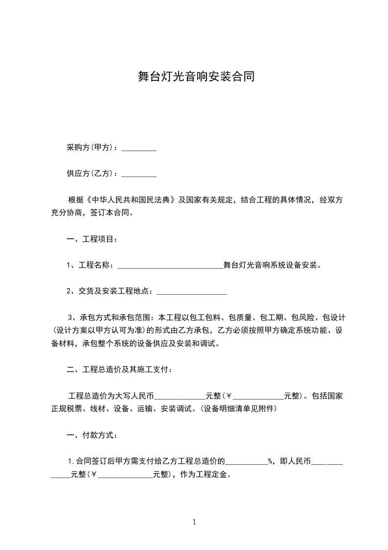 2.乙方接到甲方通知入场安装器材后,乙方需在二个工作日内携带附件中所有舞台灯光音响设备器材入场安装,安装完成经调试验收合格后甲方需在三个工作日内支付给乙方工程总造价的___________%,即人民币___________元整(¥___________元整)。