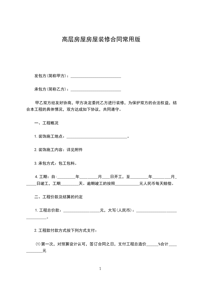 1.工程总价款:__________________元,大写(人民币):______________________________。