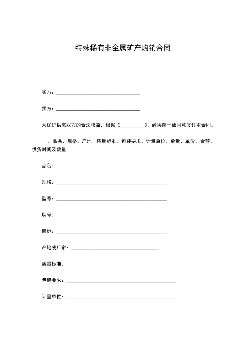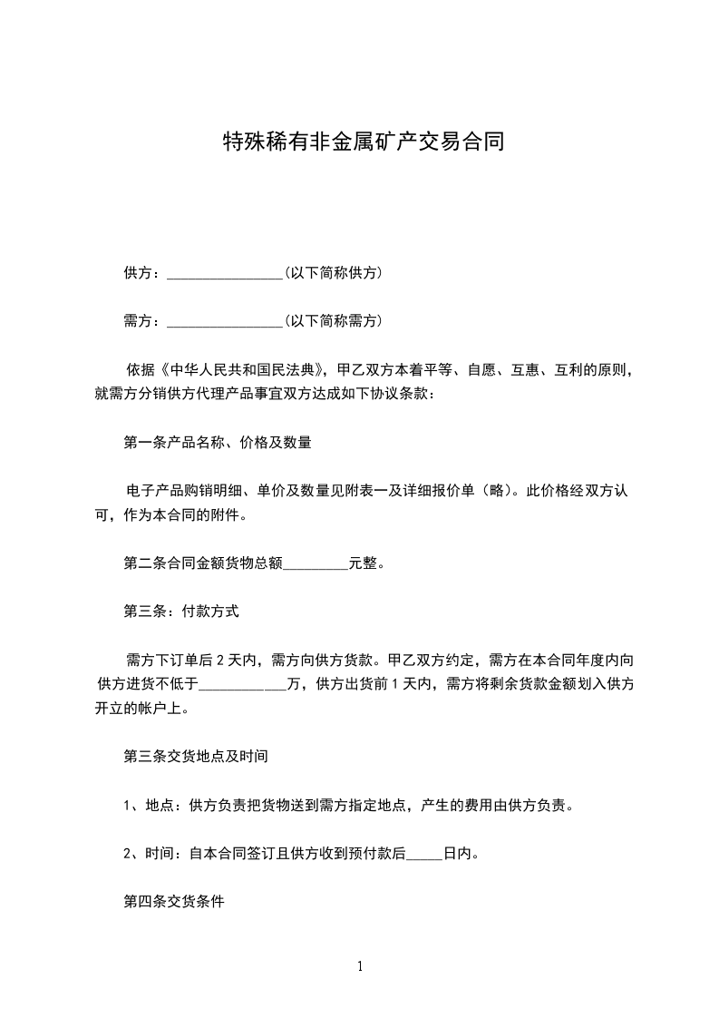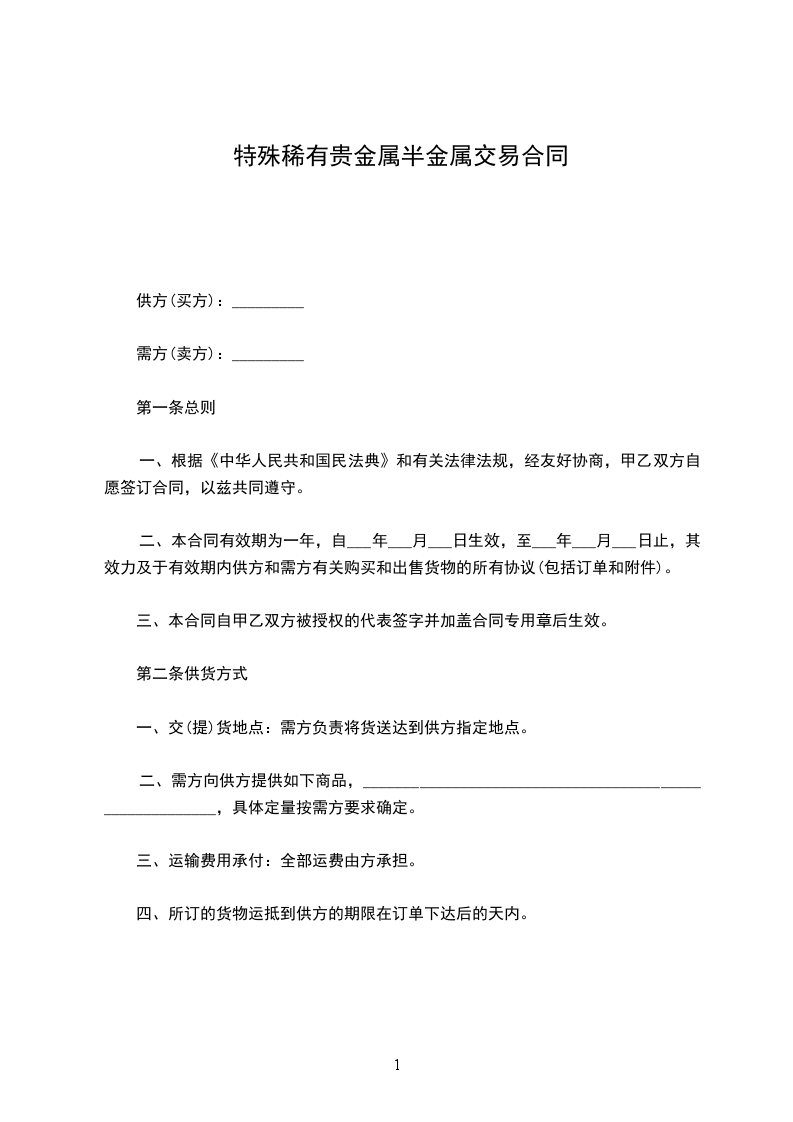 特殊稀有贵金属半金属购买合同