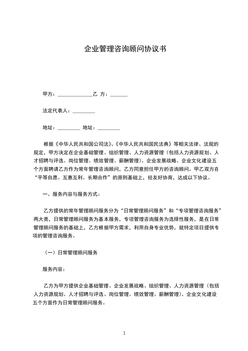 根据《中华人民共和国公司法》、《中华人民共和国民法典》等相关法律、法规的规定,甲方决定在企业基础管理、组织管理、人力资源管理(包括人力资源规划、人才招聘与评选、岗位管理、绩效管理、薪酬管理)、企业发展战略、企业文化建设五个方面聘请乙方作为常年管理咨询顾问,乙方同意担任甲方的咨询顾问。甲乙双方在“平等自愿、互惠互利、长期合作”的原则基础上,经友好协商,达成以下协议。