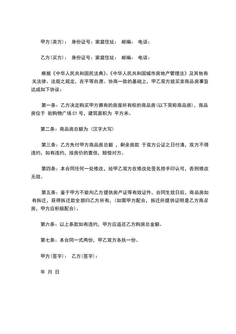 第五条:鉴于甲方不能向乙方提供房产证等有效证件,合同生效日后,商品房如有拆迁,获得拆迁款全部归乙方所有,(如需甲方配合,拆迁所提供证明是乙方商品房,甲方应积极配合)。