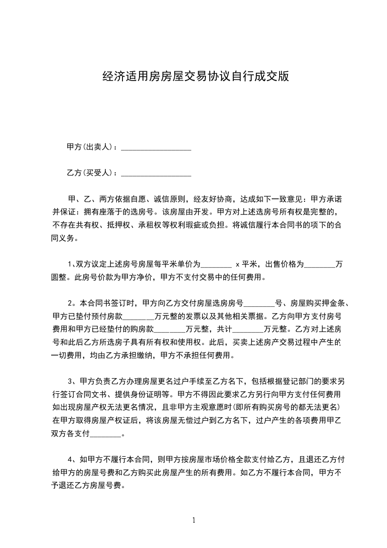 1、双方议定上述房号房屋每平米单价为________x平米,出售价格为________万圆整。此房号价款为甲方净价,甲方不支付交易中的任何费用。