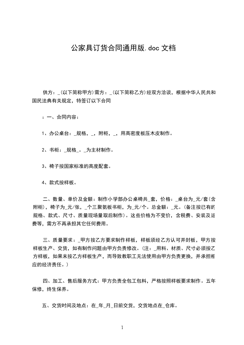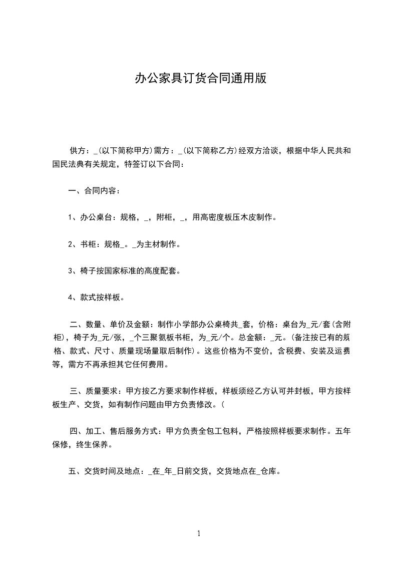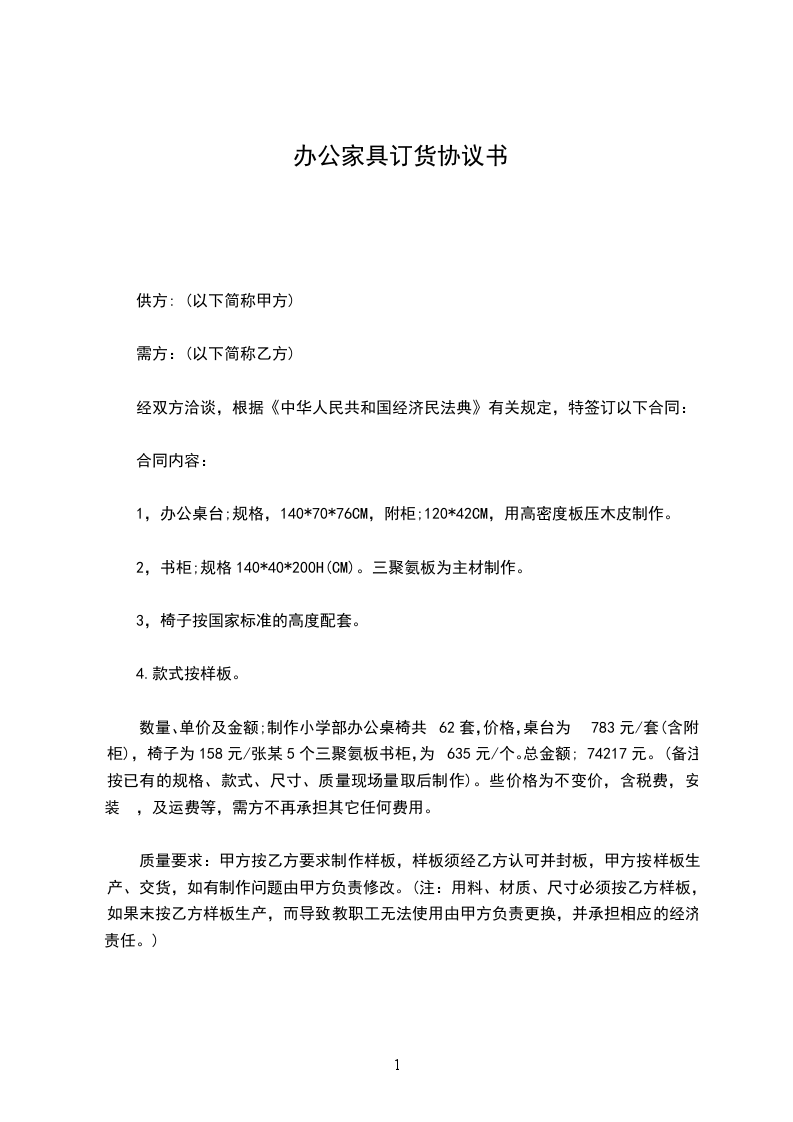 价格:_________桌台为_______________元/套(含附柜),椅子为_______________元/张,_________个三聚氨板书柜,为_______________元/个。总金额:____________元。(备注按已有的规格、款式、尺寸、质量现场量取后制作)。这些价格为不变价,含税费、安装及运费等,需方不再承担其它任何费用。