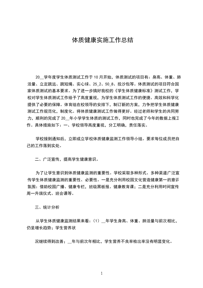 20__年学生体质监测结果表明,我校学生身体状况总体是好的,但是,仍然存在一些问题如学生身体素质的下降,肥胖学生的增多等,这些现象我们必须高度重视。针对这一现象制定如下措施:1、在工作中认真贯彻实施《学生体质健康标准》。树立健康第一的指导思想,切实加强体育工作。