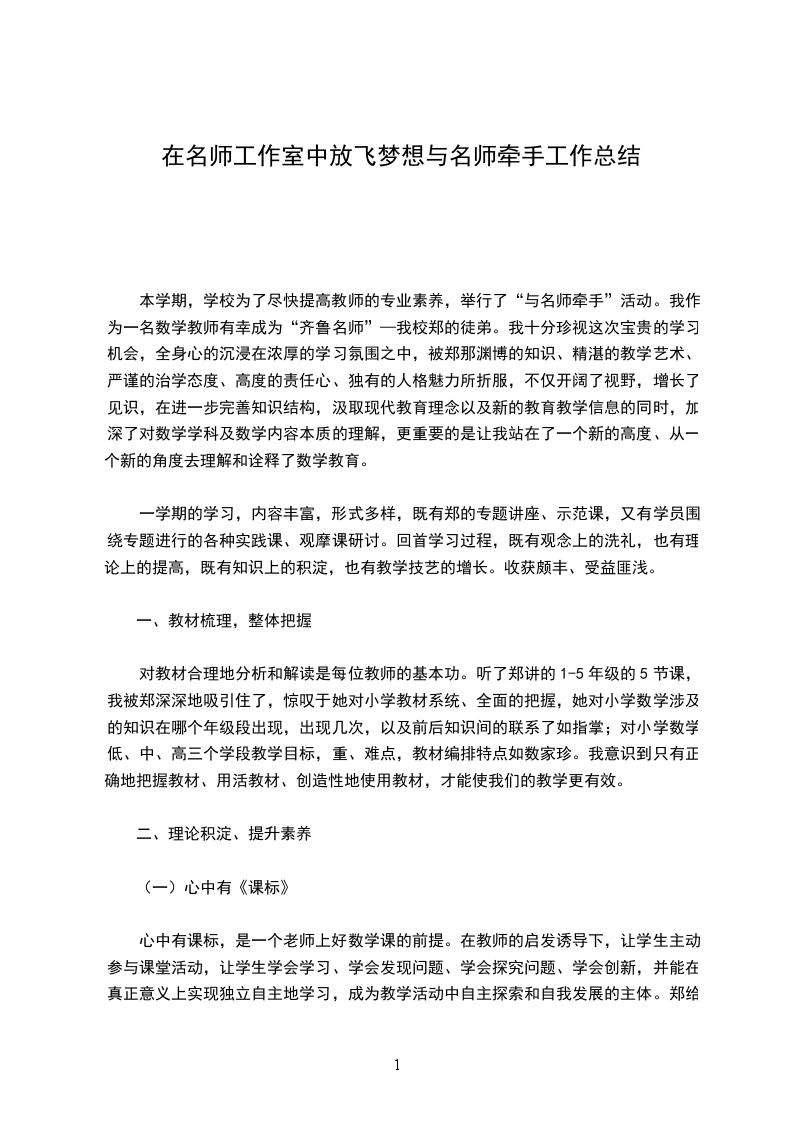 本学期,学校为了尽快提高教师的专业素养,举行了“与名师牵手”活动。我作为一名数学教师有幸成为“齐鲁名师”—我校郑的徒弟。我十分珍视这次宝贵的学习机会,全身心的沉浸在浓厚的学习氛围之中,被郑那渊博的知识、精湛的教学艺术、严谨的治学态度、高度的责任心、独有的人格魅力所折服,不仅开阔了视野,增长了见识,在进一步完善知识结构,汲取现代教育理念以及新的教育教学信息的同时,加深了对数学学科及数学内容本质的理解,更重要的是让我站在了一个新的高度、从一个新的角度去理解和诠释了数学教育。