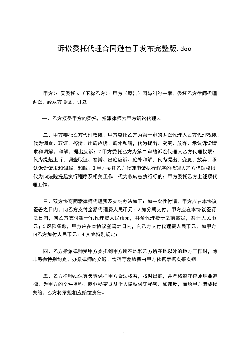 一、乙方接受甲方的委托,指派_______、________律师为甲方与____纠纷案的第_______审代理人。