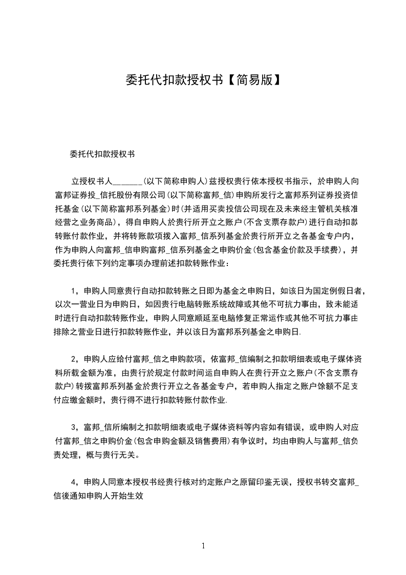 立授权书人_____________(以下简称申购人)兹授权贵行依本授权书指示,於申购人向__________公司(以下简称_________)申购所发行之富邦系列证券投资信托基金(以下简称富邦系列基金)时(并适用买卖投信公司现在及未来经主管机关核准经营之业务商品),得自申购人於贵行所开立之账户(不含支票存款户)进行自动扣款转帐付款作业,并将转帐款项拨入富邦______系列基金於贵行所开立之各基金专户内,作为申购人向__________申购__________系列基金之申购价金(包含基金价款及手续费),并委托贵行依下列约定事项办理前述扣款转帐作业: