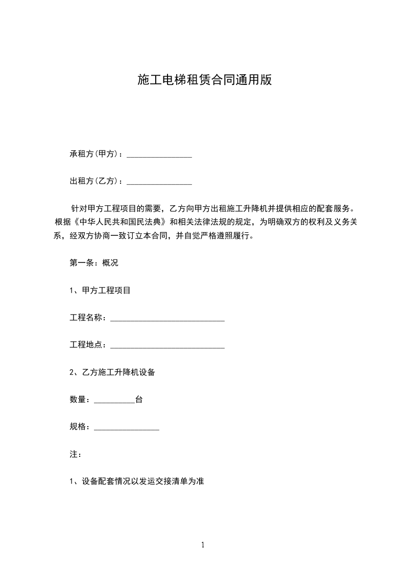 针对甲方工程项目的需要,乙方向甲方出租施工升降机并提供相应的配套服务。根据《中华人民共和国民法典》和相关法律法规的规定,为明确双方的权利及义务关系,经双方协商一致订立本合同,并自觉严格遵照履行。