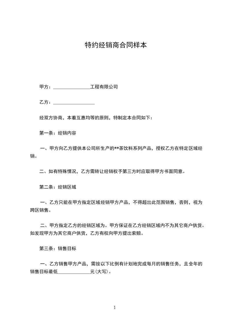 一、甲方向乙方提供本公司所生产的**茶饮料系列产品,授权乙方在特定区域经销。