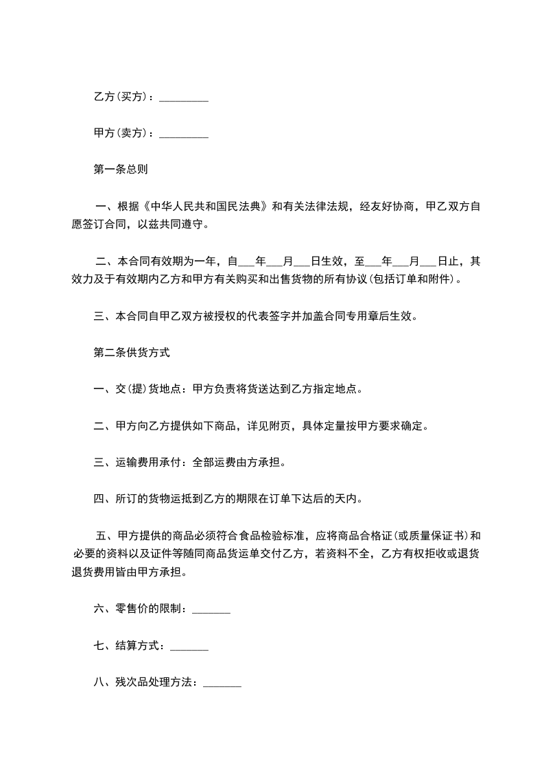 二、本合同有效期为一年,自___年___月___日生效,至___年___月___日止,其效力及于有效期内乙方和甲方有关购买和出售货物的所有协议(包括订单和附件)。