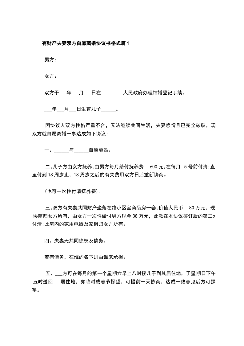有财产夫妻双方自愿离婚协议书格式篇1