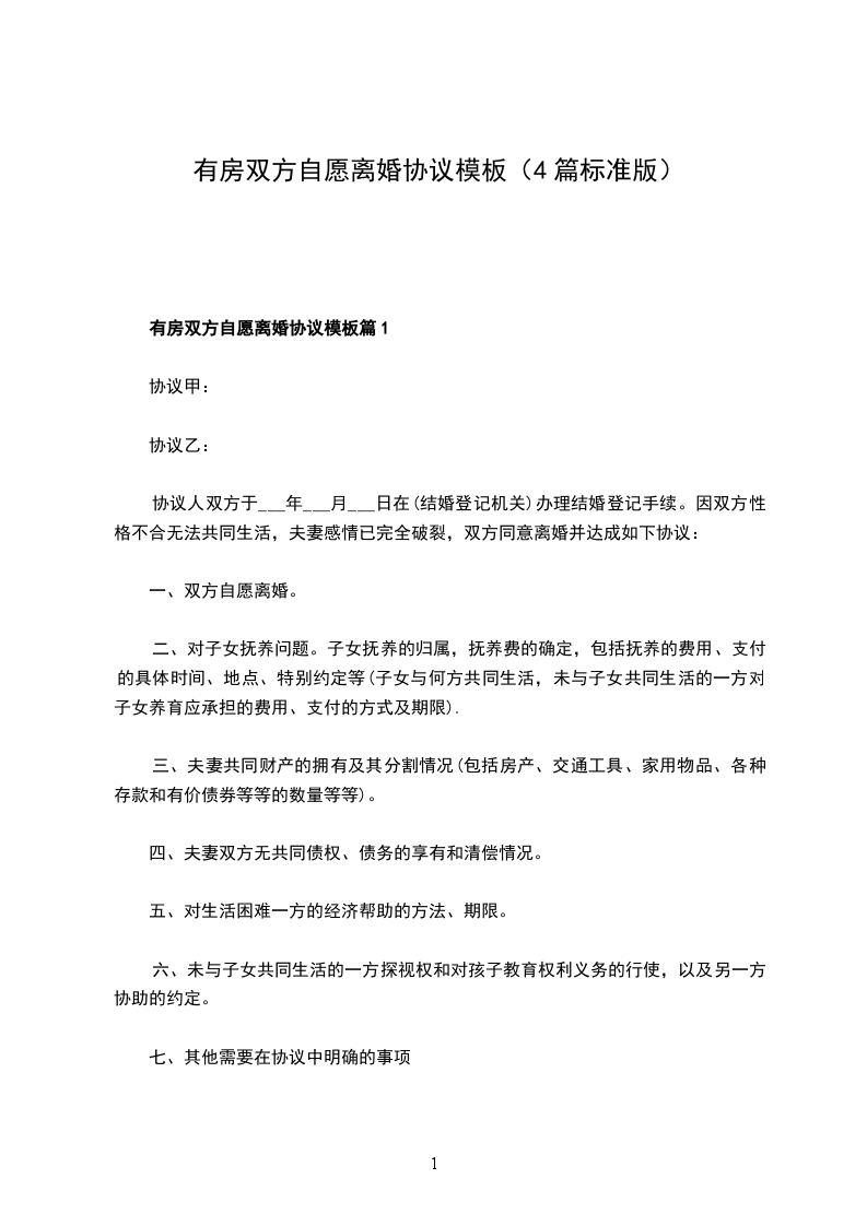 2.2乙方同意甲方独自享有位于____市____区____的商品房____%的产权(含家具家电等);甲方补偿乙方人民币____万元(大写:____________________万元整)。