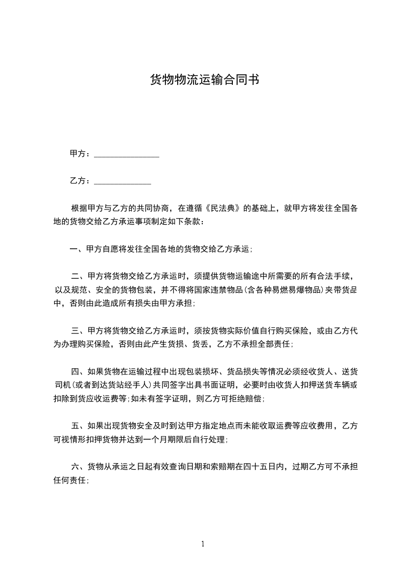 货物由乙方负责安全,如发生车辆交通事故或货物被抢、被盗、被骗、被污染及遗失、损坏均由乙方负责