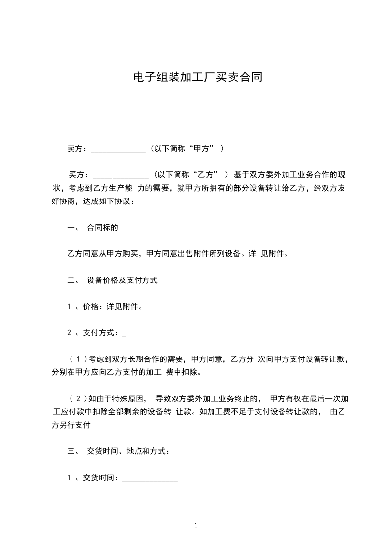 买方:______________ (以下简称“乙方” ) 基于双方委外加工业务合作的现状,考虑到乙方生产能 力的需要,就甲方所拥有的部分设备转让给乙方,经双方友 好协商,达成如下协议:
