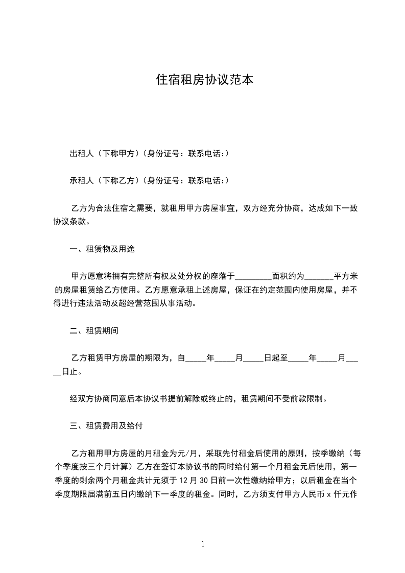 乙方为合法住宿之需要,就租用甲方房屋事宜,双方经充分协商,达成如下一致协议条款。