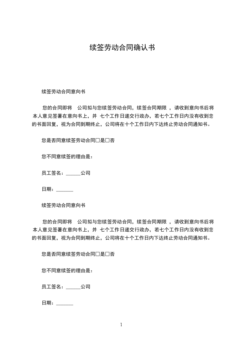您的合同即将 年日到期,公司拟与您续签劳动合同,请收到意向书后将本人意见签署在意向书上,并 七个工作日递交行政办,若七个工作日内没有收到您的书面回复,视同为合同到期终止,公司将在十个工作日内下达终止劳动合同通知书。您是否同意续签劳动合同□是□否