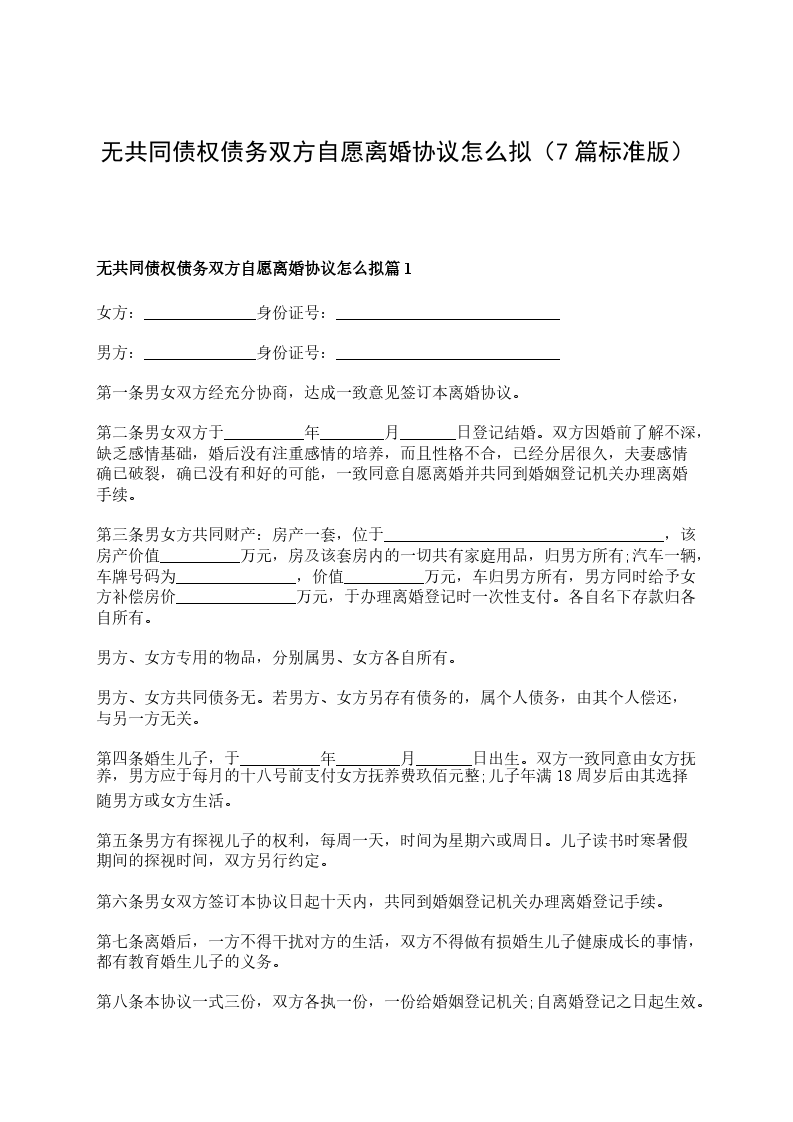 无债权双方自愿离婚协议样本篇7
