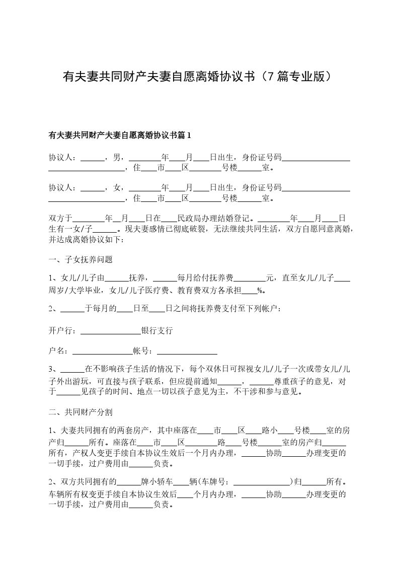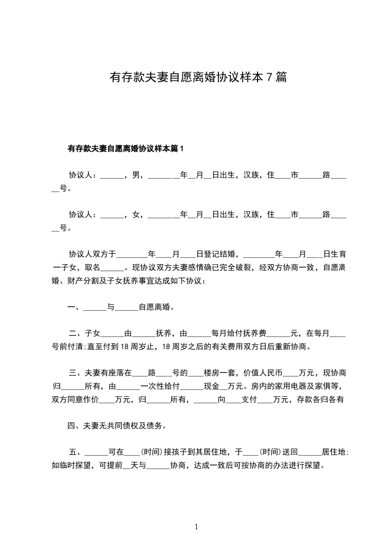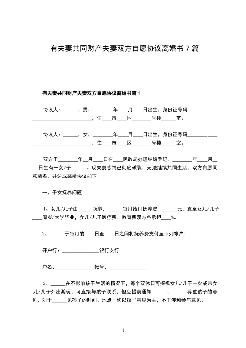 一、______与______自愿离婚。