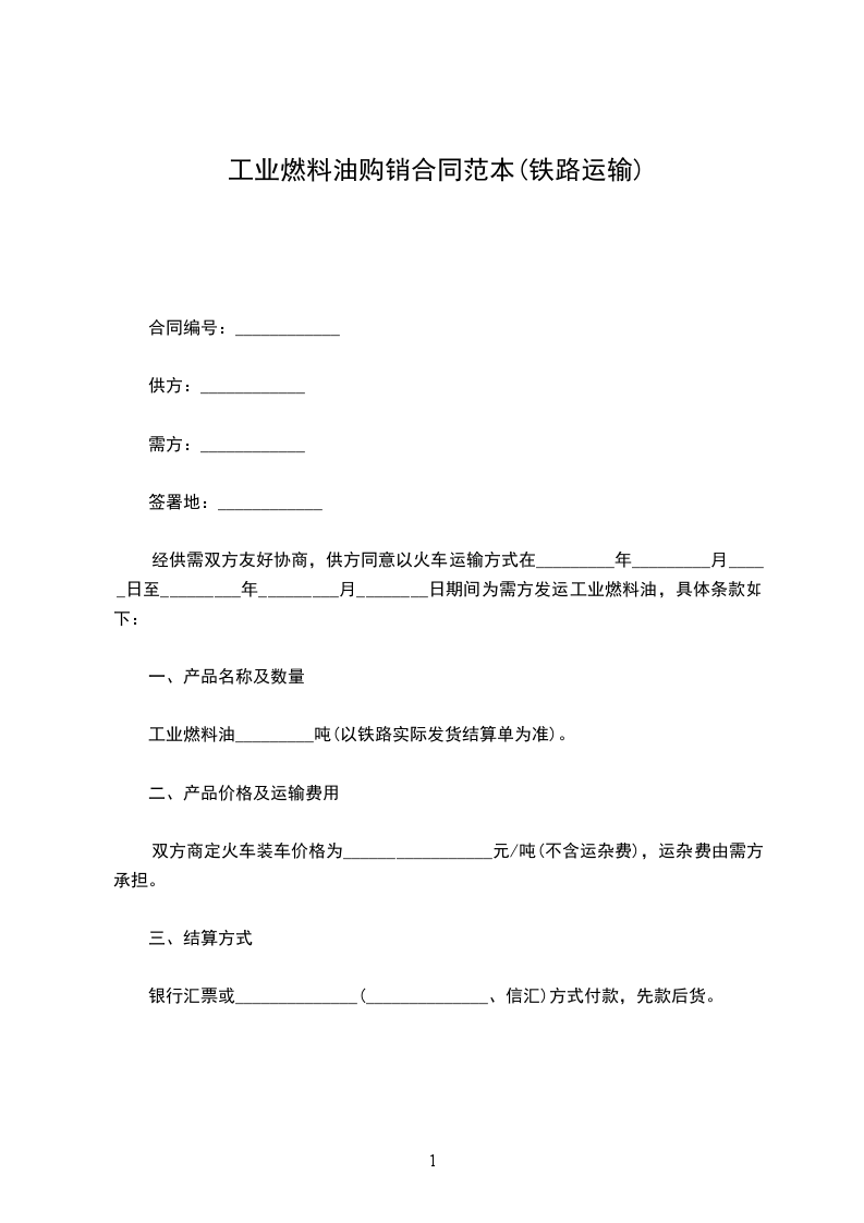 经供需双方友好协商,供方同意以火车运输方式在_________年_________月_____日至_________年_________月________日期间为需方发运工业燃料油,具体条款如下: