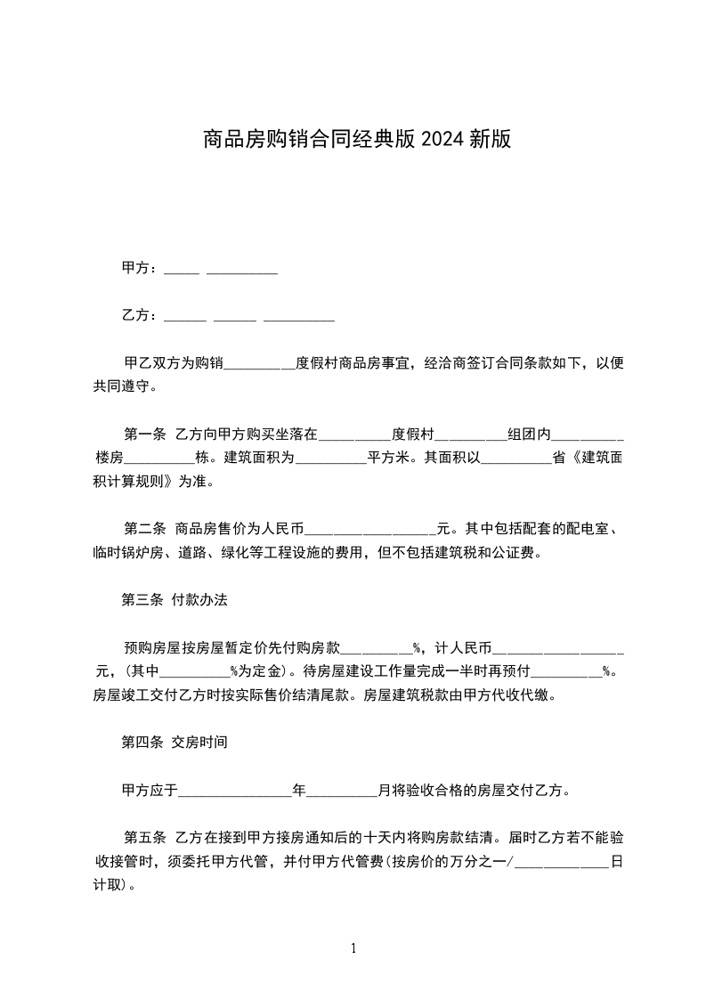 第一条 乙方向甲方购买坐落在__________度假村__________组团内__________楼房__________栋。建筑面积为__________平方米。其面积以__________省《建筑面积计算规则》为准。