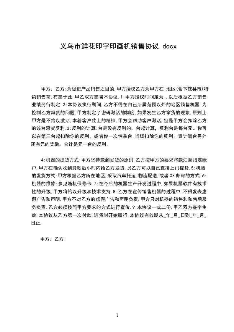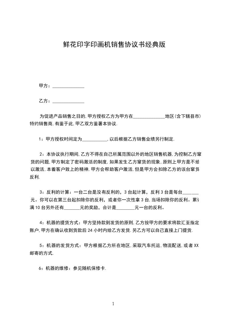为促进产品销售之目的,甲方授权乙方为甲方在______________地区(含下辖县市)特约销售商,有鉴于此,甲乙双方鉴署本协议.