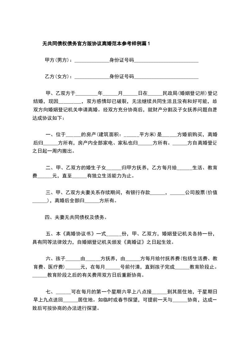 1、甲乙双方确认在婚姻关系存续期间没有发生共同债务。