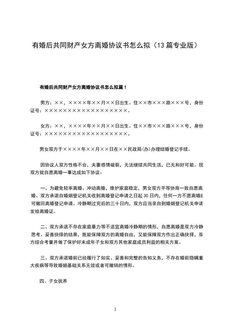 八、本协议一式三份,男、女双方各执一份,婚姻登记机关存档一份。