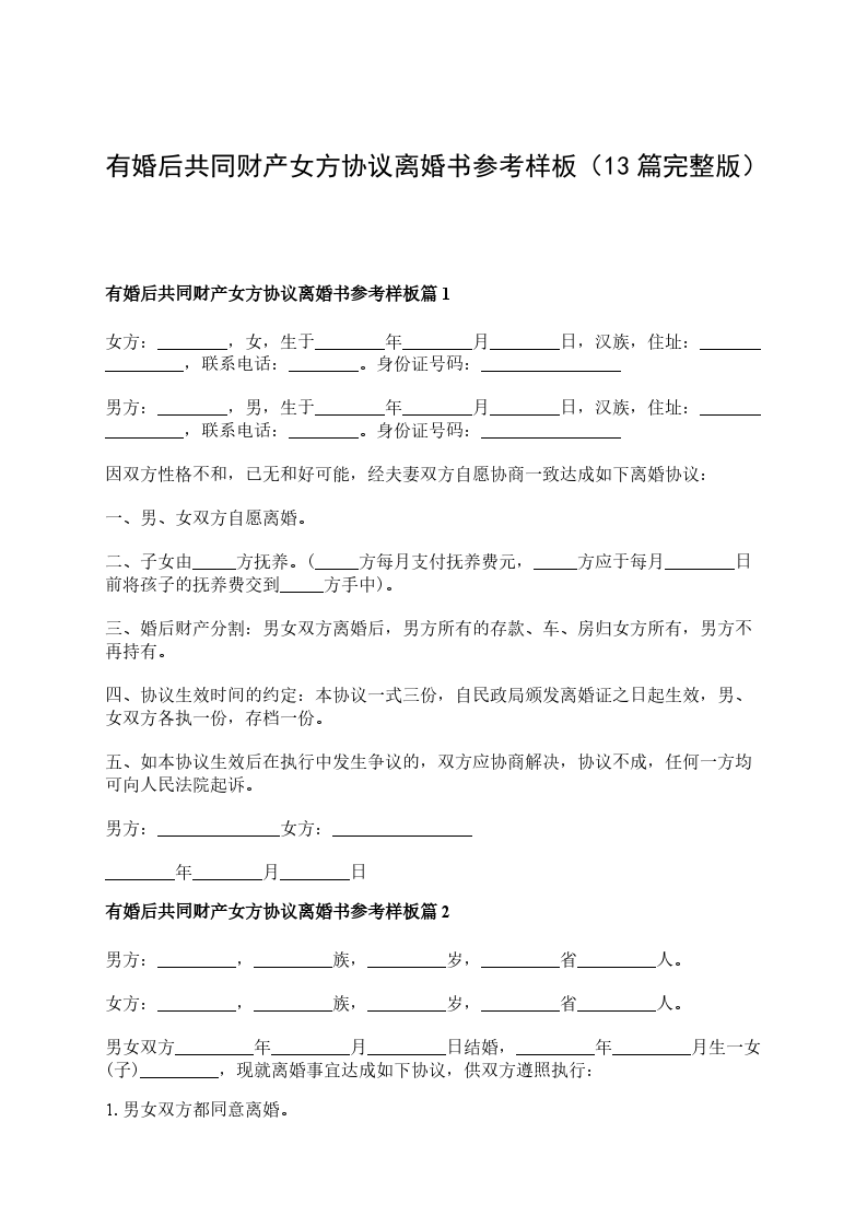 女方:__,女,汉族,____年____月____日生,住______,身份证号______________________________。