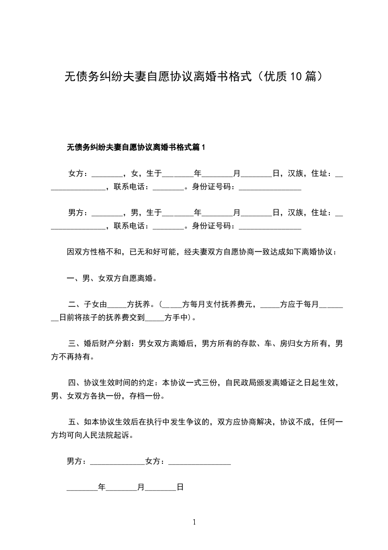 无债务纠纷夫妻自愿协议离婚书格式篇10