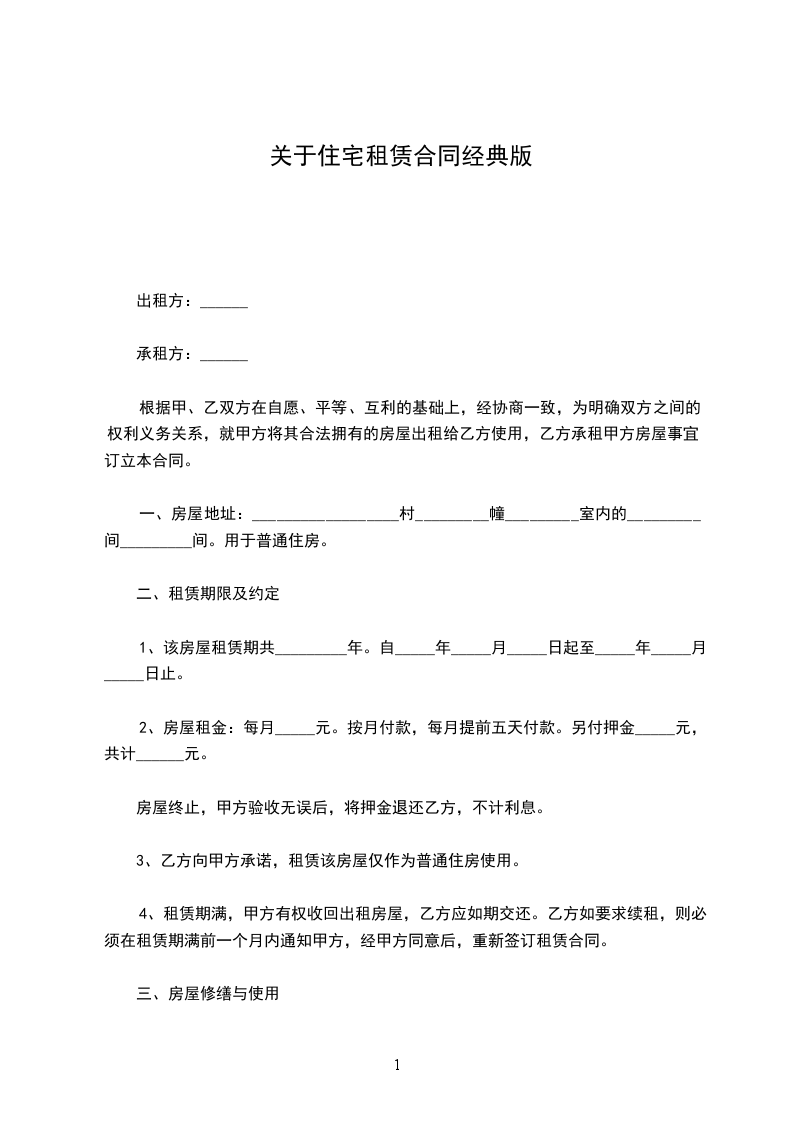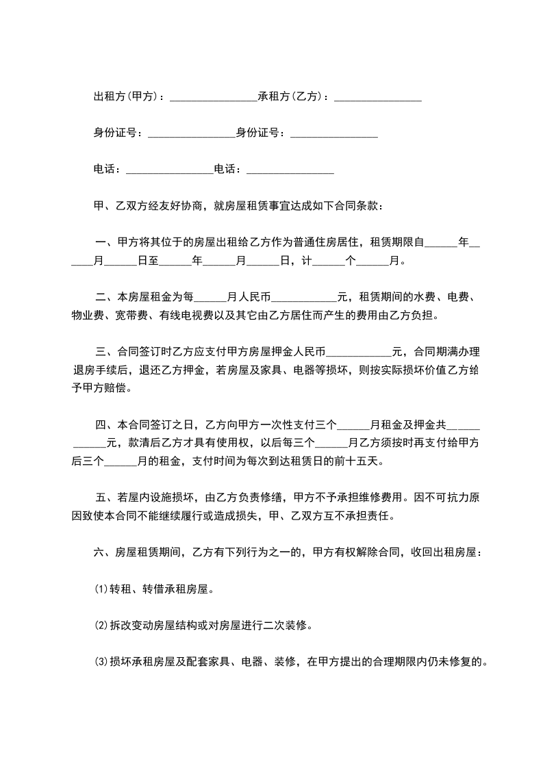 一、甲方将其位于的房屋出租给乙方作为普通住房居住,租赁期限自______年______月______日至______年______月______日,计______个______月。