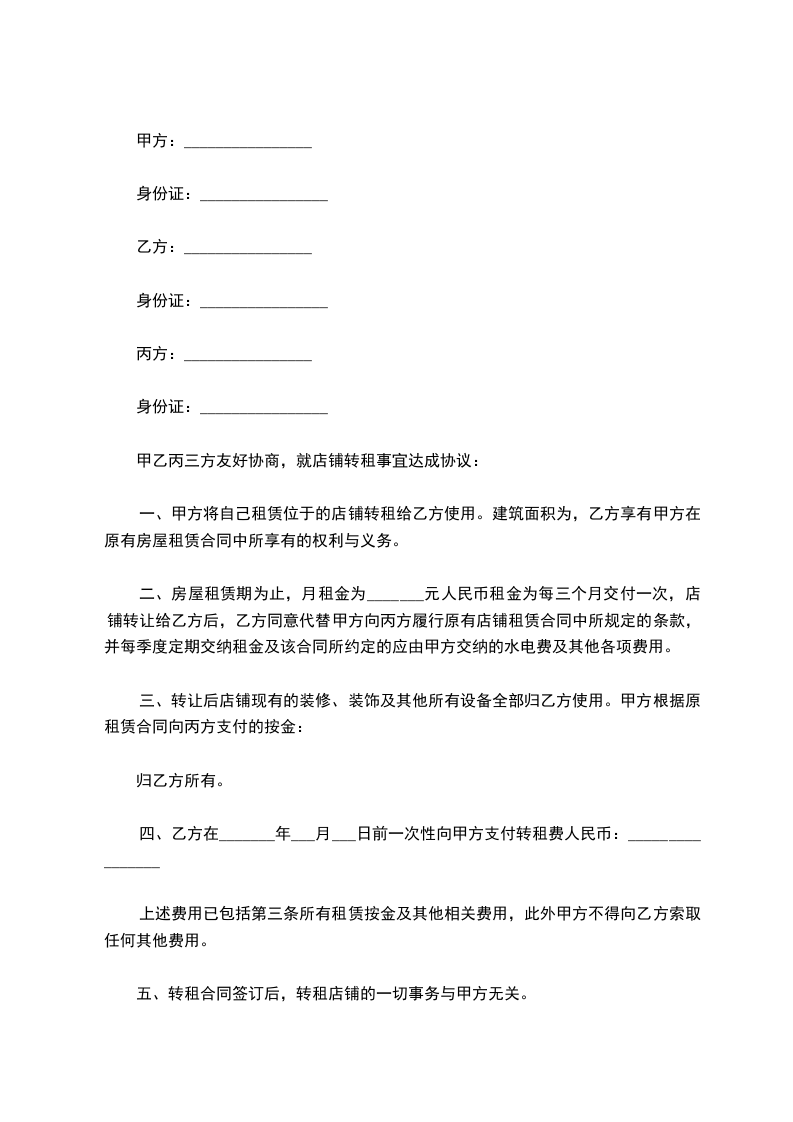 甲乙丙三方友好协商,就店铺转租事宜达成协议: