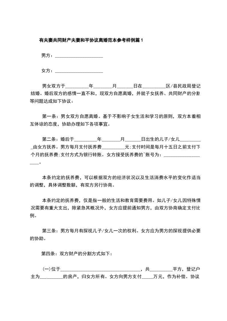 1、【存款】双方婚姻关系存续期间,目前共有存款____元,其中男方账户____元,女方账户____元,双方同意,____方在本协议签订之日起3日内给付____方____元。