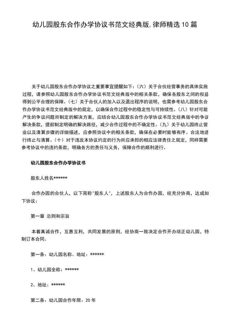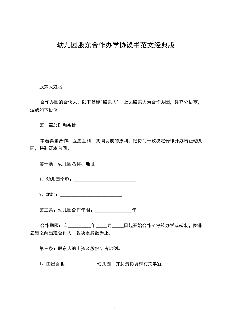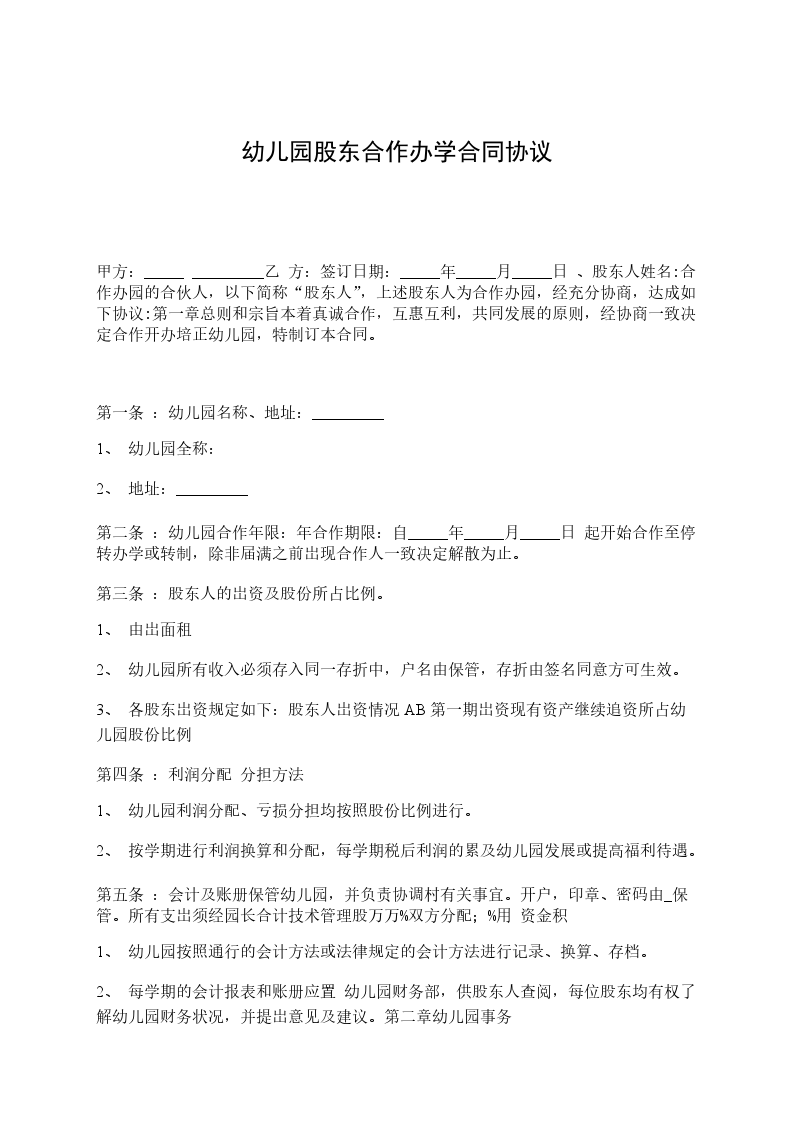 合作办园的合伙人,以下简称"股东人",上述股东人为合作办园,经充分协商,达成如下协议: