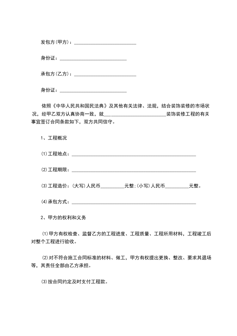 依照《中华人民共和国民法典》及其他有关法律、法规,结合装饰装修的市场状况,经甲乙双方认真协商一致,就__________________________装饰装修工程的有关事宜签订合同条款如下,双方共同信守。