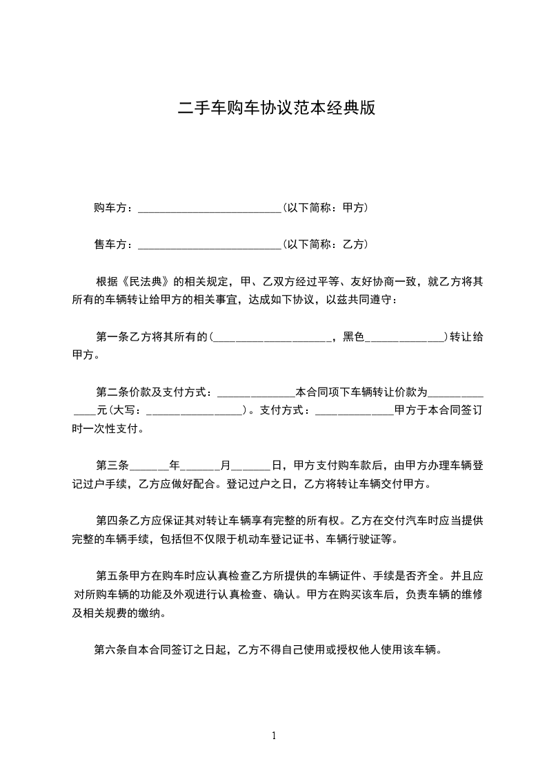 第二条价款及支付方式:______________本合同项下车辆转让价款为______________元(大写:_________________)。支付方式:______________甲方于本合同签订时一次性支付。