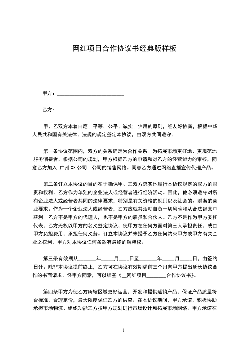 第三条有效期从_______年_____月____日至_______年_____月_____日,由签约日计。除非本协议提前终止,乙方可在协议有效期满前三个月向甲方提出延长协议合作的书面请求,经甲方同意,可以续签《__网红项目________合作协议书》。