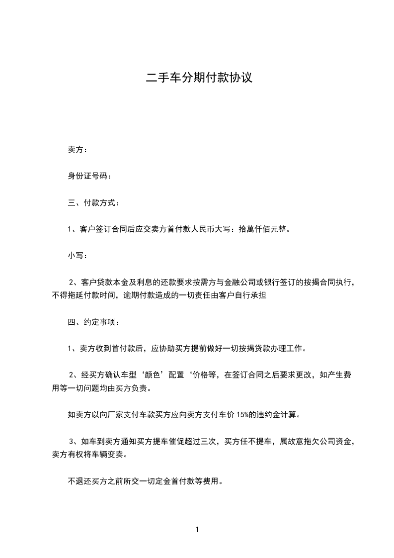 一、乙方所购汽车的总价为人民币()元(大写)______________元,其中首付款为人民币()元(大写)________________________元,贷款人民币()元(大写)___________________元,乙方在合同签订之日即向甲方支付首款()元。