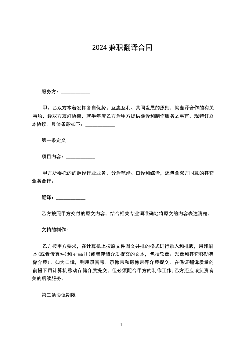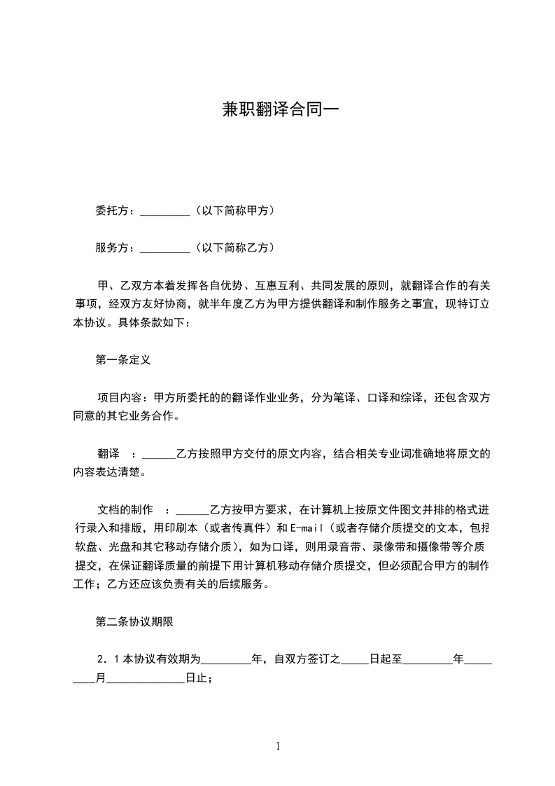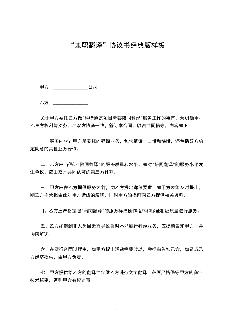 一、服务内容:甲方所委托的翻译业务,包含笔译、口译和综译,还包括双方约定同意的其他业务合作。