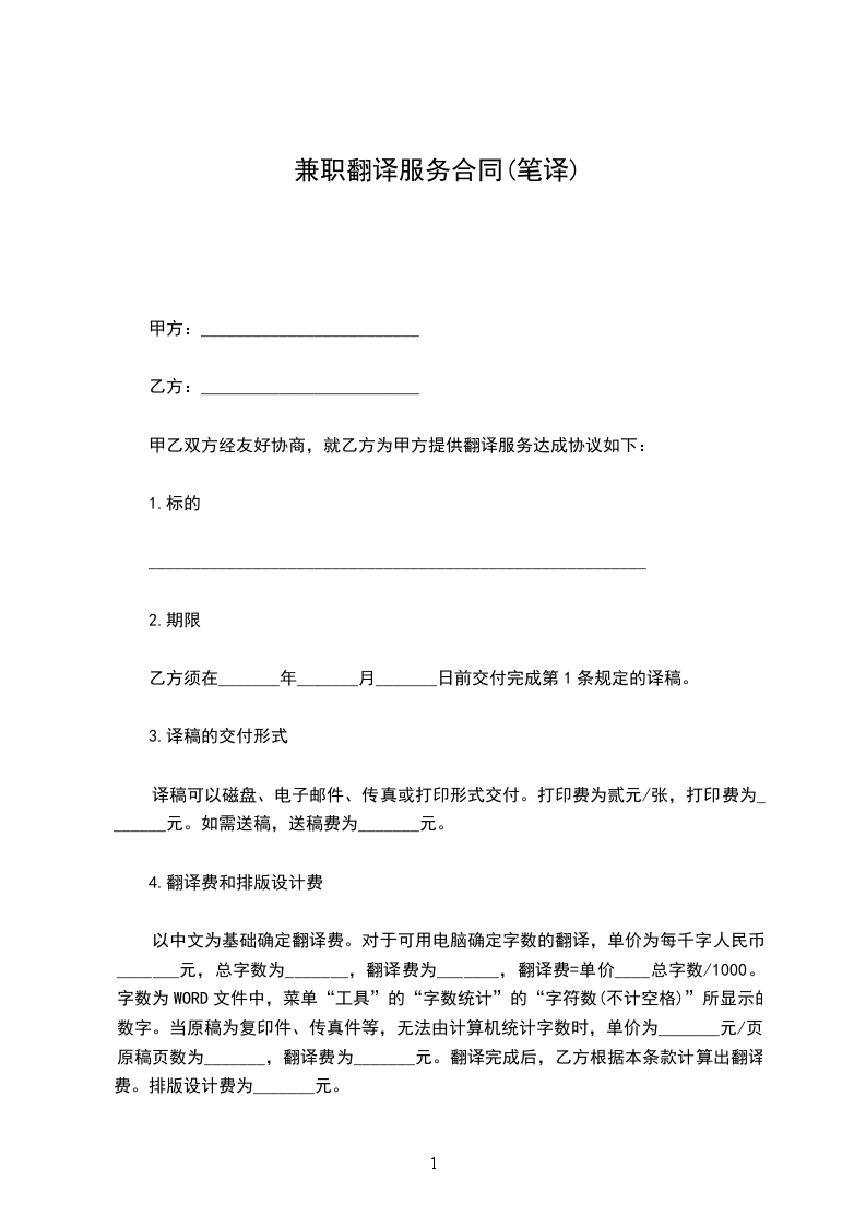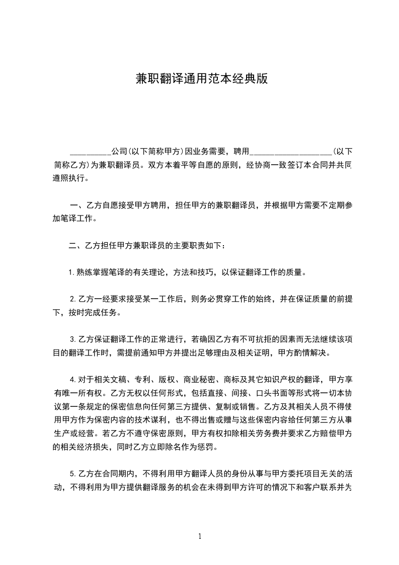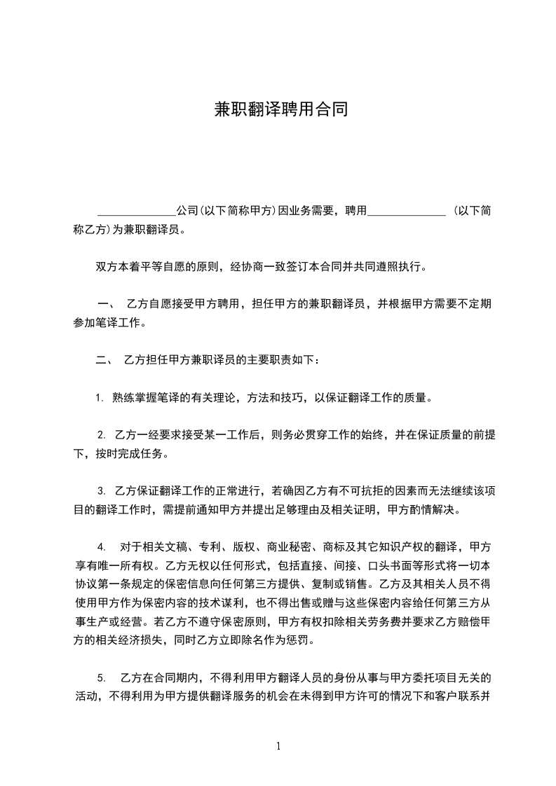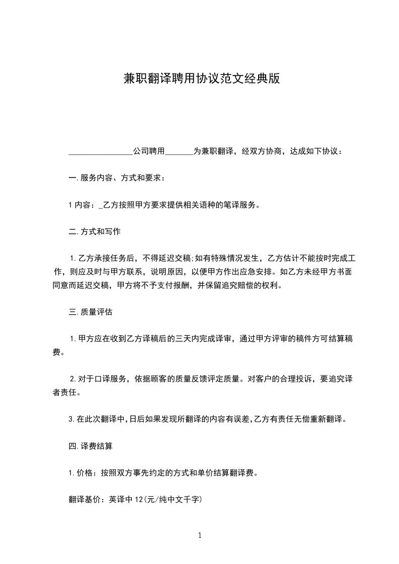 一、服务内容:甲方所委托的翻译业务,包含笔译、口译和综译,还包括双方约定同意的其他业务合作。
