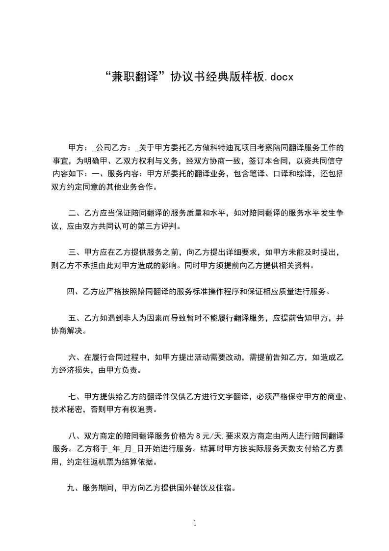 八、双方商定的"陪同翻译"服务价格为8元/天,要求双方商定由两人进行"陪同翻译"服务。乙方将于___________年_______月_______日开始进行服务。结算时甲方按实际服务天数支付给乙方费用,约定往返机票为结算依据。