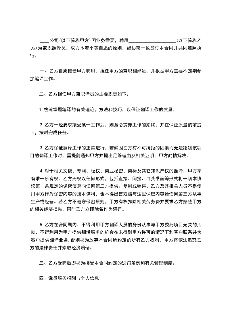 四、乙方应严格按照"陪同翻译"的服务标准操作程序和保证相应质量进行服务。