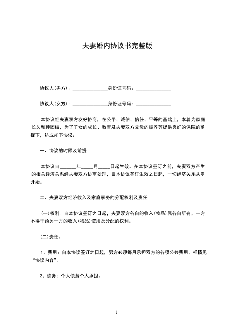 本协议经夫妻双方友好协商,在公平、诚信、信任、平等的基础上,本着为家庭长久和睦团结,为了子女的成长、教育及夫妻双方父母的赡养等提供良好的保障的前提下,达成如下协议: