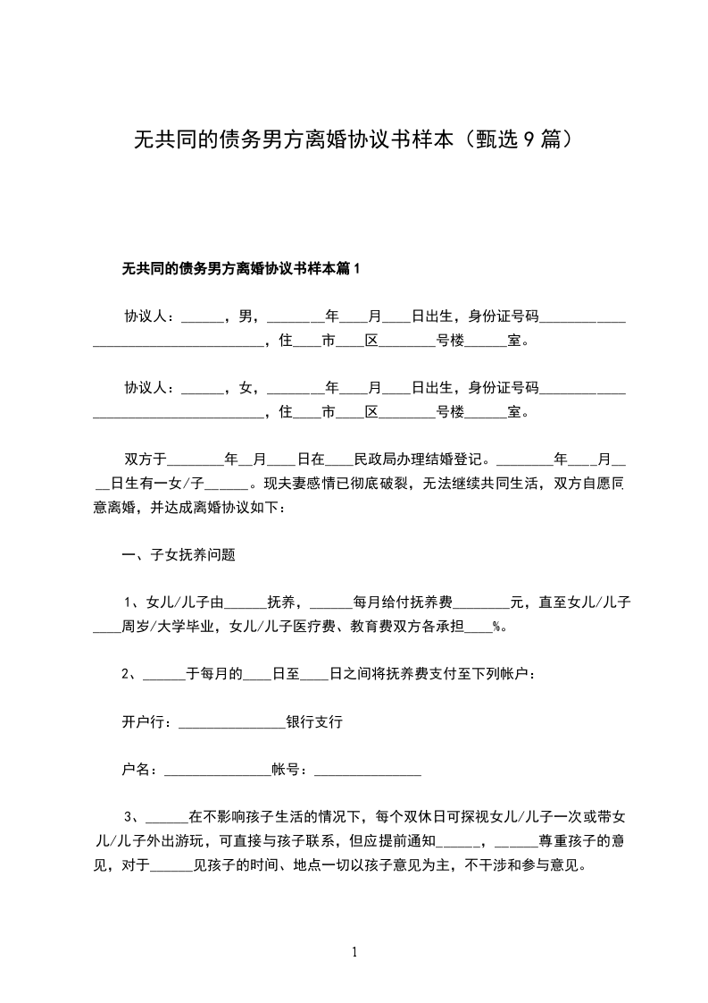 1、甲乙双方确认在婚姻关系存续期间无共同债务;