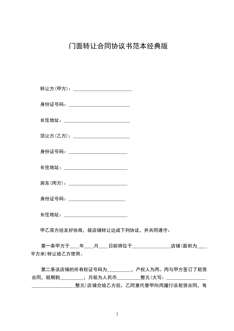 第一条甲方于____年____月____日前将位于________________店铺(面积为____平方米)转让给乙方使用。