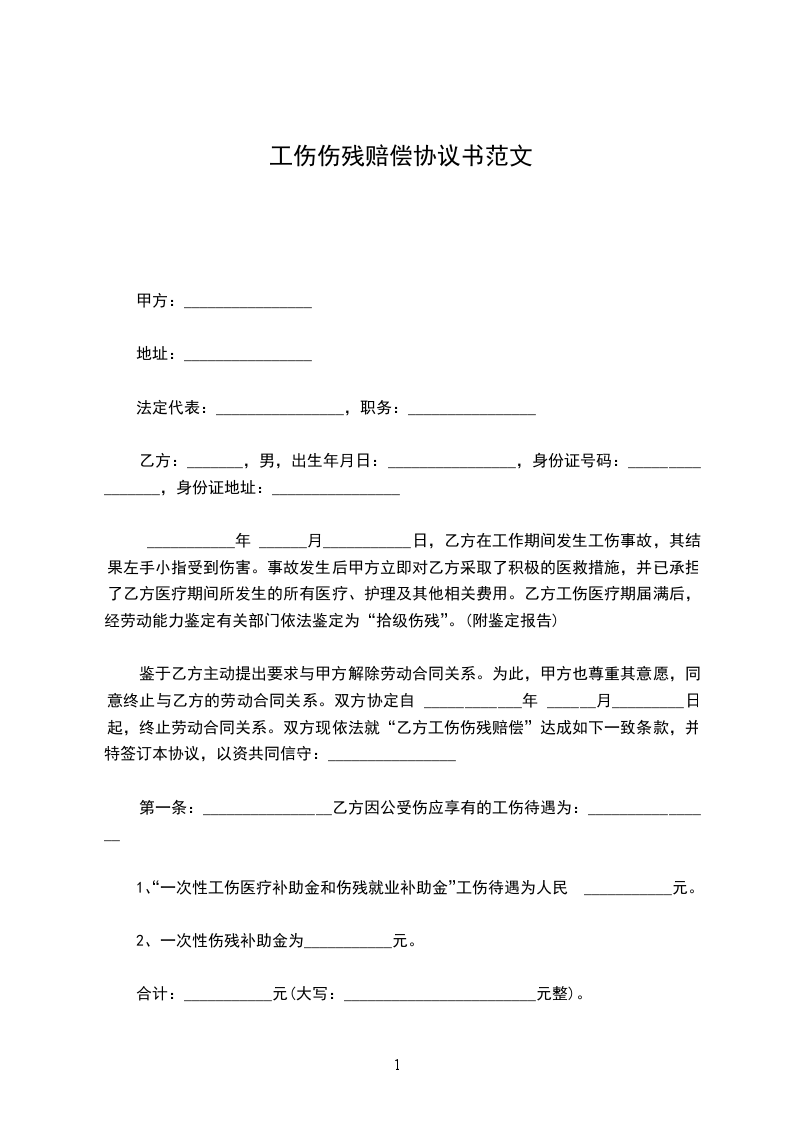 鉴于乙方主动提出要求与甲方解除劳动合同关系。为此,甲方也尊重其意愿,同意终止与乙方的劳动合同关系。双方协定自 ____________年 ______月_________日起,终止劳动合同关系。双方现依法就“乙方工伤伤残赔偿”达成如下一致条款,并特签订本协议,以资共同信守:________________