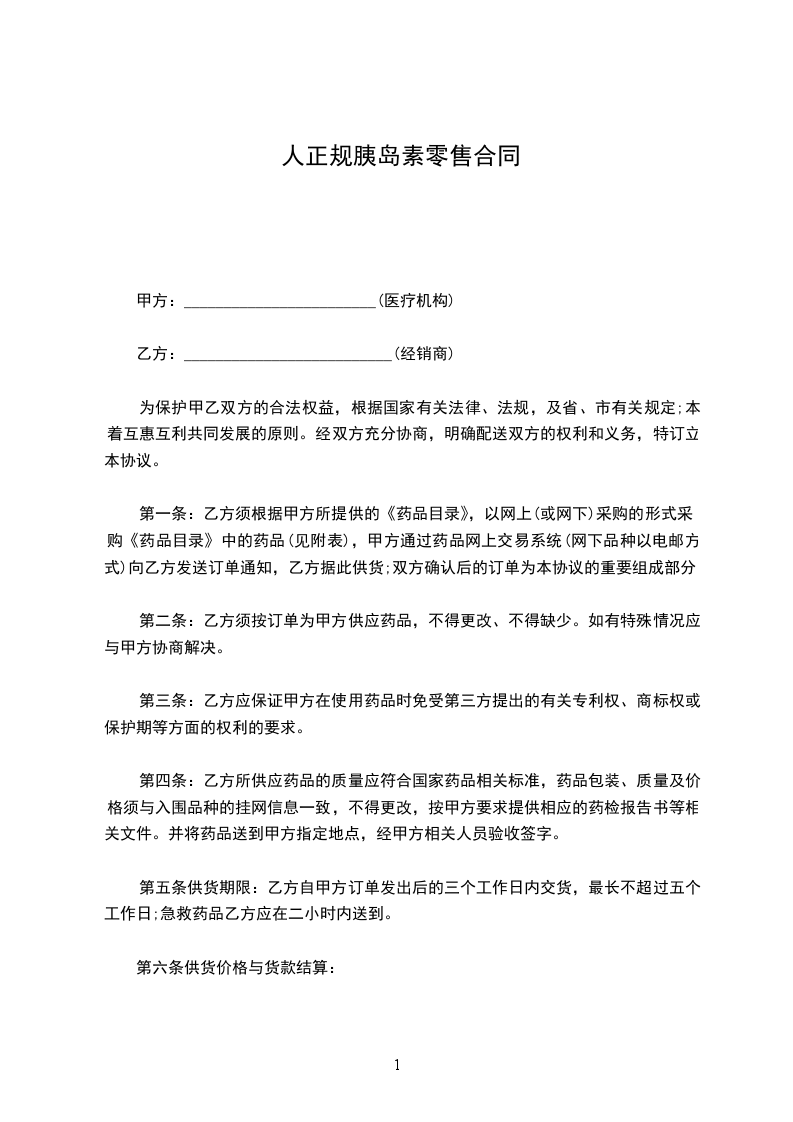 人正规胰岛素零售合同
