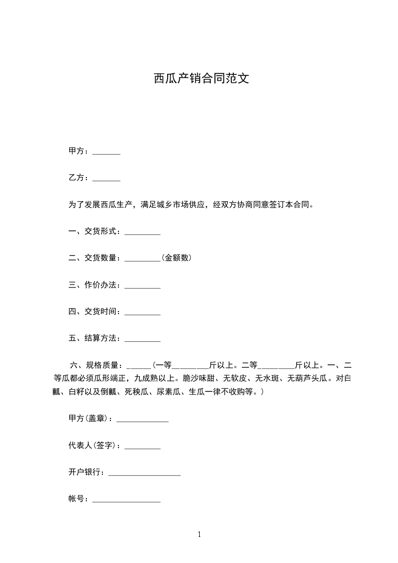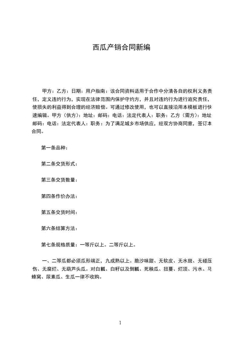 六、规格质量:______(一等_________斤以上。二等_________斤以上。一、二等瓜都必须瓜形端正,九成熟以上。脆沙味甜、无软皮、无水斑、无葫芦头瓜。对白瓤、白籽以及倒瓤、死秧瓜、尿素瓜、生瓜一律不收购等。)