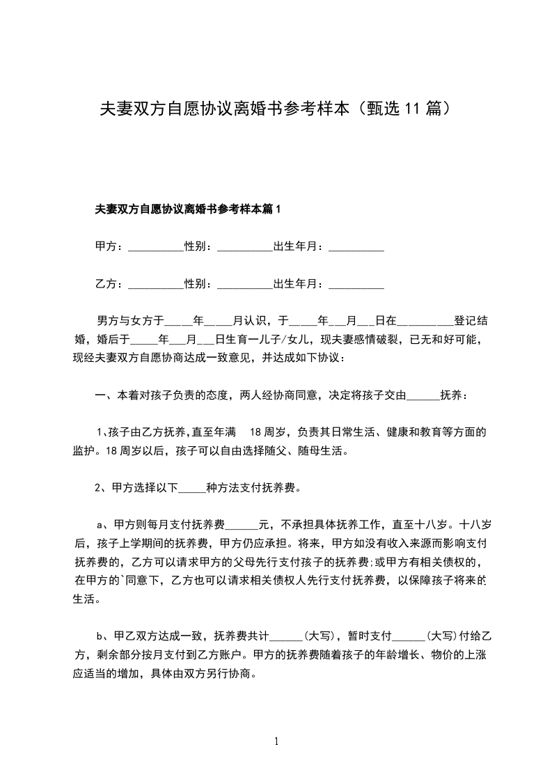 一、__________与__________自愿离婚。
