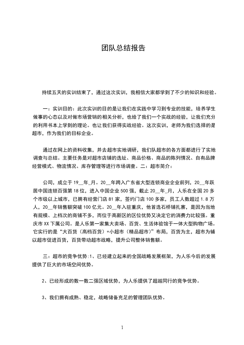 四:实训内容:本次实训共五天,每天都有不同的内容和任务。第一天:我们成立了一个三个人的团队,易担任组长,组员分别是刘、罗。并确定了我们的组名:Sky,确定团队口号为:乐途自在,随心飞翔。理念:轻快、活泼、俏皮的团队气氛,团结、合作、真诚的团队信念,自信、果断、勇敢的团队精神。第二天:我们的主要任务是了解超市的历史背景,以及在全国范围内的竞争优势,收集一些资料,列出一个简单的调查内容包括:超市简介、超市选址、经营模式及陈列情况等。第三天:我们一大早便来到超市,进行实地考察。经历的带领下,我们参观了收货部、仓库、卖场等地方,了解一些收货验货的流程。我们好多同学还抽空闲时间疯狂购物呢。这次实地考察,是我们都受益匪浅,第一次真正意义上去了解一个超市的背景及流程,心中的疑问也解决了不少。第四天:我们又回到了实验室,将昨天去实地考察的记录和分析从新整理了一遍,把相关的信息做成了一个ppt,能把一些自己收获的东西分享给大家。