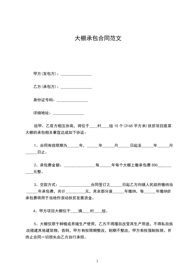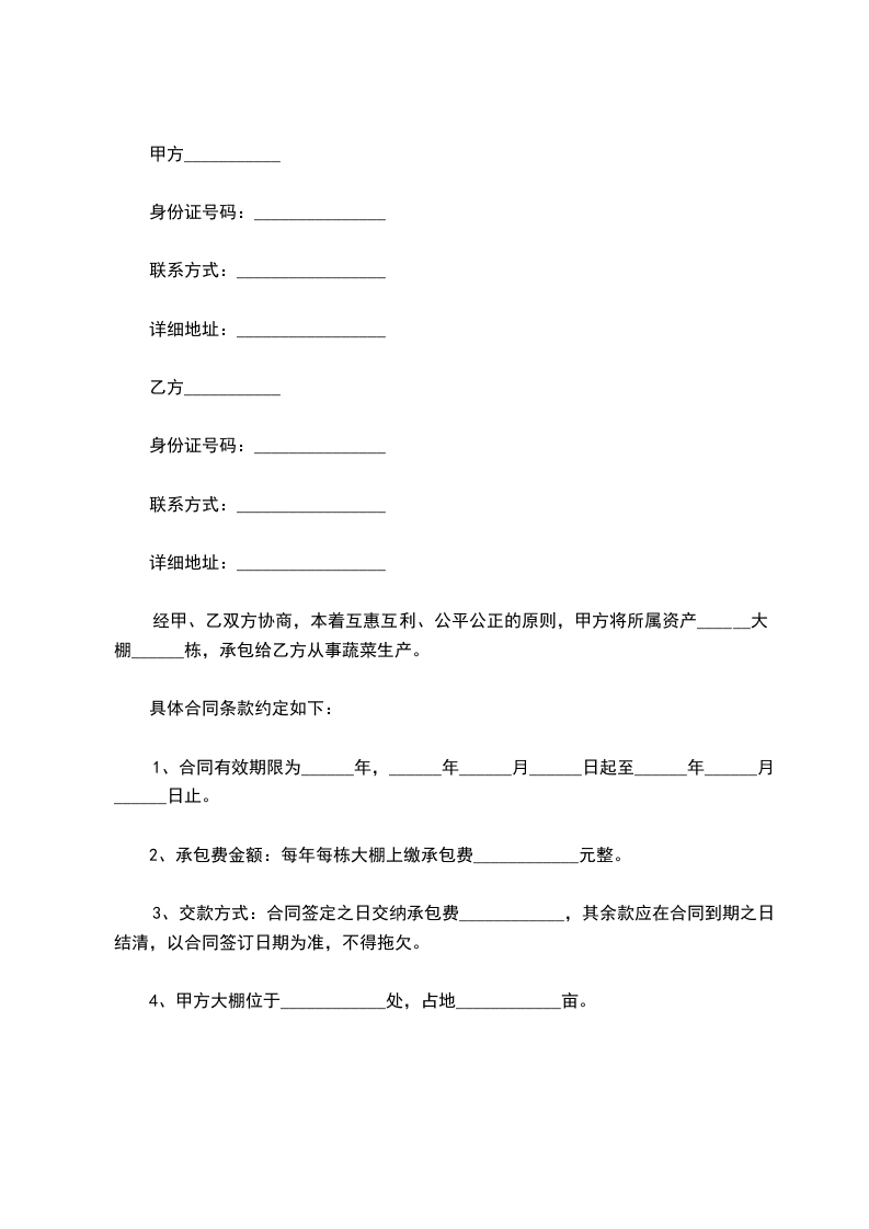 7、乙方不得将所承包的大棚转包给他人经营,一经发现甲方将解除乙方承包权,合同终止,大棚回收,因此而造成的经济损失由乙方自行承担,承包费不予退回。